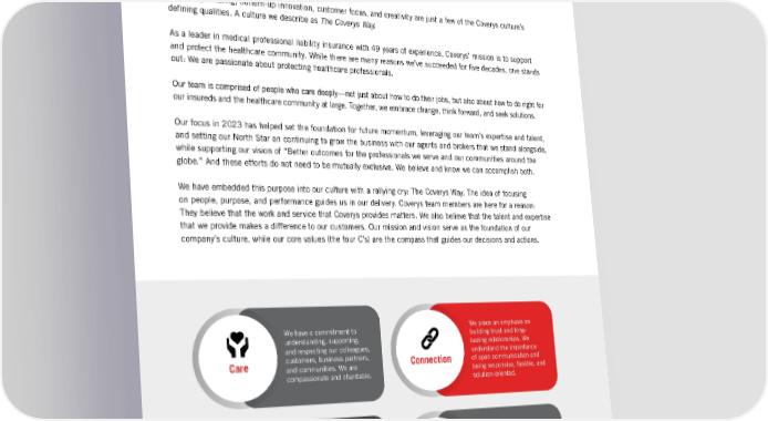 A FOCUS ON MOMENTUM PASSION + PARTNERSHIP DEFINING THE COVERYS WAY Knowledge sharing, bottom-up innovation, customer focus, and creativity are just a few of the Coverys culture’s de昀椀ning qualities. A culture we describe as The Coverys Way. As a leader in medical professional liability insurance with 49 years of experience, Coverys’ mission is to support and protect the healthcare community. While there are many reasons we’ve succeeded for 昀椀ve decades, one stands out: We are passionate about protecting healthcare professionals. Our team is comprised of people who care deeply—not just about how to do their jobs, but also about how to do right for our insureds and the healthcare community at large. Together, we embrace change, think forward, and seek solutions. Our focus in 2023 has helped set the foundation for future momentum, leveraging our team’s expertise and talent, and setting our North Star on continuing to grow the business with our agents and brokers that we stand alongside, while supporting our vision of “Better outcomes for the professionals we serve and our communities around the globe.” And these efforts do not need to be mutually exclusive. We believe and know we can accomplish both. We have embedded this purpose into our culture with a rallying cry: The Coverys Way. The idea of focusing on people, purpose, and performance guides us in our delivery. Coverys team members are here for a reason: They believe that the work and service that Coverys provides matters. We also believe that the talent and expertise that we provide makes a difference to our customers. Our mission and vision serve as the foundation of our company’s culture, while our core values (the four C’s) are the compass that guides our decisions and actions. We have a commitment to We place an emphasis on understanding, supporting, building trust and long- and respecting our colleagues, lasting relationships. We customers, business partners, understand the importance Care and communities. We are Connection of open communication and compassionate and charitable. being responsive, 昀氀exible, and solution-oriented. We have a culture that We believe in progress, encourages working together innovation, and learning. to generate new ideas and We focus on improving and Collaboration creative solutions. We ask for Continuous developing products, services, and listen to feedback as a way Development and ourselves. to achieve better outcomes. 10