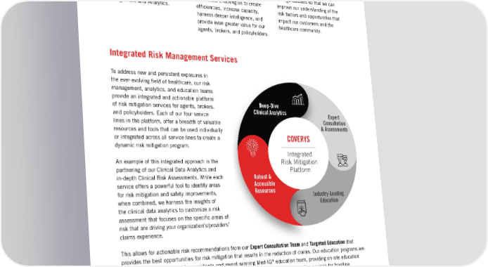 ACTIONS=MOMENTUM Expanded risk management New Enterprise Project Management Transformative data intelligence expertise (EPMO) of昀椀ce We’re using arti昀椀cial intelligence With years of industry experience, This team is helping us to to identify insights from an array Dana Siegal has taken the helm quickly and effectively streamline of large datasets so that we can as our new Vice President of Risk processes, enabling us to create improve our understanding of the Management and Analytics. ef昀椀ciencies, increase capacity, risk factors and opportunities that harness deeper intelligence, and impact our customers and the provide even greater value for our healthcare community. agents, brokers, and policyholders. Integrated Risk Management Services To address new and persistent exposures in the ever-evolving 昀椀eld of healthcare, our risk management, analytics, and education teams provide an integrated and actionable platform Deep-Dive of risk mitigation services for agents, brokers, Clinical Analytics and policyholders. Each of our four service Expert lines in the platform, offer a breadth of valuable Consultation resources and tools that can be used individually & Assessments or integrated across all service lines to create a COVERYS dynamic risk mitigation program. Integrated An example of this integrated approach is the Risk Mitigation partnering of our Clinical Data Analytics and Platform in-depth Clinical Risk Assessments. While each Robust & service offers a powerful tool to identify areas Accessible for risk mitigation and safety improvements, Resources when combined, we harness the insights of Industry-Leading Education the clinical data analytics to customize a risk assessment that focuses on the speci昀椀c areas of risk that are driving your organization’s/providers’ claims experience. This allows for actionable risk recommendations from our Expert Consultation Team and Targeted Education that provides the best opportunities for risk mitigation that results in the reduction of claims. Our education programs are developed by our expert risk consultants and award-winning Med-IQ® education team, providing on-site education programs customized to your speci昀椀c risk needs and concerns, CME/CE certi昀椀ed online courses for frontline clinicians, and professional development programs for your risk team. Together we're 昀椀nding new ways to help healthcare professionals reduce claims by mitigating risks on the front line. 9