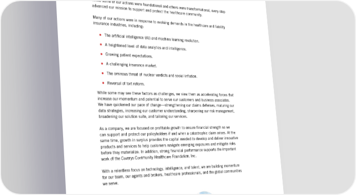 A FOCUS ON MOMENTUM Actions create momentum. Each seemingly small step builds upon the next, generating a series of victories, creating energy and velocity until the spark of momentum takes over. In 2023, our team created momentum with a multitude of actions. While some of our actions were foundational and others were transformational, every step advanced our mission to support and protect the healthcare community. Many of our actions were in response to evolving demands in the healthcare and liability insurance industries, including: • The arti昀椀cial intelligence (AI) and machine learning revolution. • A heightened level of data analytics and intelligence. • Growing patient expectations. • A challenging insurance market. • The ominous threat of nuclear verdicts and social in昀氀ation. • Reversal of tort reform. While some may see these factors as challenges, we view them as accelerating forces that increase our momentum and potential to serve our customers and business associates. We have quickened our pace of change—strengthening our claims defenses, maturing our data strategies, increasing our customer understanding, sharpening our risk management, broadening our solution suite, and tailoring our services. As a company, we are focused on pro昀椀table growth to ensure 昀椀nancial strength so we can support and protect our policyholders if and when a catastrophic claim arises. At the same time, growth in surplus provides the capital needed to develop and deliver innovative products and services to help customers navigate emerging exposures and mitigate risks before they materialize. In addition, strong 昀椀nancial performance supports the important work of the Coverys Community Healthcare Foundation, Inc. With a relentless focus on technology, intelligence, and talent, we are building momentum for our team, our agents and brokers, healthcare professionals, and the global communities we serve. Brenda E. Richardson, MD Joseph G. Murphy Chair of the Board CEO & President 22