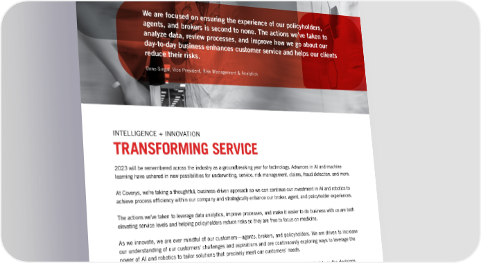 We are focused on ensuring the experience of our policyholders, agents, and brokers is second to none. The actions we’ve taken to analyze data, review processes, and improve how we go about our day-to-day business enhances customer service and helps our clients reduce their risks. Dana Siegal, Vice President, Risk Management & Analytics INTELLIGENCE + INNOVATION TRANSFORMING SERVICE 2023 will be remembered across the industry as a groundbreaking year for technology. Advances in AI and machine learning have ushered in new possibilities for underwriting, service, risk management, claims, fraud detection, and more. At Coverys, we're taking a thoughtful, business-driven approach so we can continue our investment in AI and robotics to achieve process ef昀椀ciency within our company and strategically enhance our broker, agent, and policyholder experiences. The actions we've taken to leverage data analytics, improve processes, and make it easier to do business with us are both elevating service levels and helping policyholders reduce risks so they are free to focus on medicine. As we innovate, we are ever mindful of our customers—agents, brokers, and policyholders. We are driven to increase our understanding of our customers' challenges and aspirations and are continuously exploring ways to leverage the power of AI and robotics to tailor solutions that precisely meet our customers' needs. While Coverys has always been a data-forward organization, we know that data is only as valuable as the decisions it inspires, and that decisions can only be effective if they are informed by the contexts in which they are made. To that end, we are evolving our data-driven strategies—striving to move beyond descriptive or diagnostic analytics to predictive insights that drive informed business decisions and strategy. By advancing our data-driven intelligence and tech-enabled agility, we can engage our customers in ways that are increasingly targeted, tailored, and impactful. 88