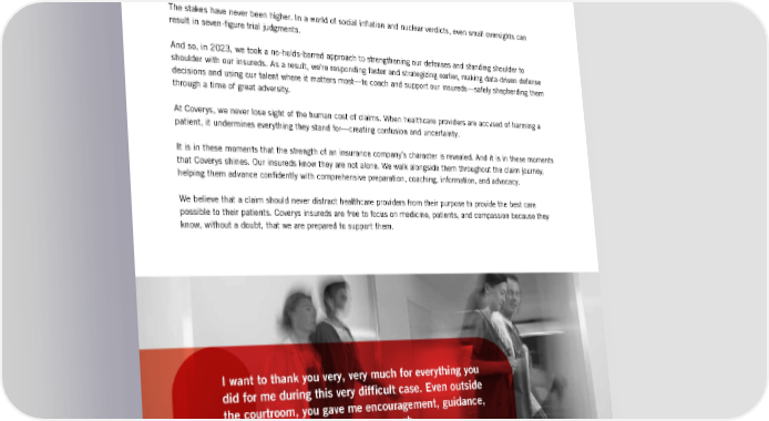 A FOCUS ON MOMENTUM STRATEGY + SUPPORT PREPARING TO PROTECT The stakes have never been higher. In a world of social in昀氀ation and nuclear verdicts, even small oversights can result in seven-昀椀gure trial judgments. And so, in 2023, we took a no-holds-barred approach to strengthening our defenses and standing shoulder to shoulder with our insureds. As a result, we’re responding faster and strategizing earlier, making data-driven defense decisions and using our talent where it matters most—to coach and support our insureds—safely shepherding them through a time of great adversity. At Coverys, we never lose sight of the human cost of claims. When healthcare providers are accused of harming a patient, it undermines everything they stand for—creating confusion and uncertainty. It is in these moments that the strength of an insurance company’s character is revealed. And it is in these moments that Coverys shines. Our insureds know they are not alone. We walk alongside them throughout the claim journey, helping them advance con昀椀dently with comprehensive preparation, coaching, information, and advocacy. We believe that a claim should never distract healthcare providers from their purpose to provide the best care possible to their patients. Coverys insureds are free to focus on medicine, patients, and compassion because they know, without a doubt, that we are prepared to support them. I want to thank you very, very much for everything you did for me during this very difficult case. Even outside the courtroom, you gave me encouragement, guidance, and counsel. I can’t thank you enough. Coverys Insured 66