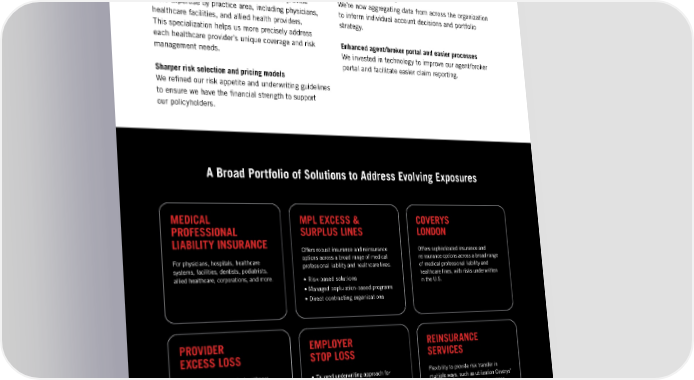 ACTIONS=MOMENTUM In addition to expanding our solution portfolio, we have refocused on underwriting acumen and are taking the following actions: Customer-focused underwriting 360-degree decisions We restructured our underwriting teams to provide We’re now aggregating data from across the organization more expertise by practice area, including physicians, to inform individual account decisions and portfolio healthcare facilities, and allied health providers. strategy. This specialization helps us more precisely address each healthcare provider’s unique coverage and risk Enhanced agent/broker portal and easier processes management needs. We invested in technology to improve our agent/broker portal and facilitate easier claim reporting. Sharper risk selection and pricing models We re昀椀ned our risk appetite and underwriting guidelines to ensure we have the 昀椀nancial strength to support our policyholders. A Broad Portfolio of Solutions to Address Evolving Exposures MEDICAL MPL EXCESS & COVERYS PROFESSIONAL SURPLUS LINES LONDON LIABILITY INSURANCE Offers robust insurance and reinsurance Offers sophisticated insurance and For physicians, hospitals, healthcare options across a broad range of medical reinsurance options across a broad range systems, facilities, dentists, podiatrists, professional liability and healthcare lines. of medical professional liability and allied healthcare, corporations, and more. • Risk-based solutions healthcare lines, with risks underwritten in the U.S. • Managed poplulation-based programs • Direct contracting organizations PROVIDER EMPLOYER REINSURANCE EXCESS LOSS STOP LOSS SERVICES For physicians, hospitals, healthcare • Tailored underwriting approach for Flexibility to provide risk transfer in systems, facilities, dentists, podiatrists, proactive risk mitigation multiple ways, such as utilization Coverys’ allied healthcare, and corporations. captive cells or facultative reinsurance • Self-funded employers of customers’ own captive insurance companies. 55
