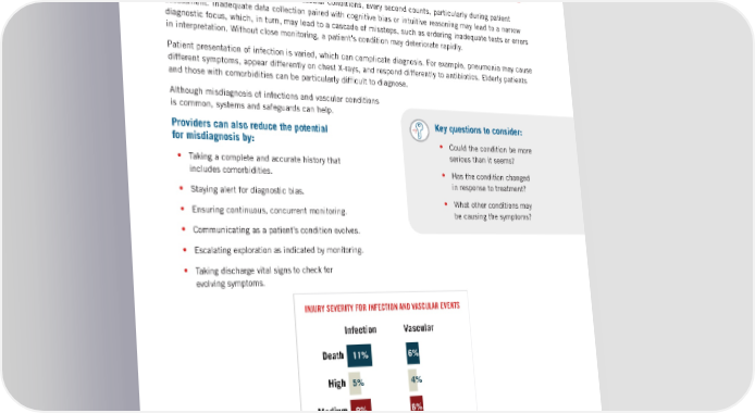OFTEN DISGUISED INFECTIONS & VASCULAR CONDITIONS In situations involving infections and vascular conditions, every second counts, particularly during patient assessment. Inadequate data collection paired with cognitive bias or intuitive reasoning may lead to a narrow diagnostic focus, which, in turn, may lead to a cascade of missteps, such as ordering inadequate tests or errors in interpretation. Without close monitoring, a patient’s condition may deteriorate rapidly. Patient presentation of infection is varied, which can complicate diagnosis. For example, pneumonia may cause different symptoms, appear differently on chest X-rays, and respond differently to antibiotics. Elderly patients and those with comorbidities can be particularly difficult to diagnose. Although misdiagnosis of infections and vascular conditions is common, systems and safeguards can help. Providers can also reduce the potential for misdiagnosis by: • Taking a complete and accurate history that includes comorbidities. • Staying alert for diagnostic bias. • Ensuring continuous, concurrent monitoring. • Communicating as a patient’s condition evolves. • Escalating exploration as indicated by monitoring. • Taking discharge vital signs to check for evolving symptoms. ( 9 ) INJURY SEVERITY FOR INFECTION AND VASCULAR EVENTS Infection Vascular Low Medium High Death 1% 9% 5% 4% 11% 6% 1% 6% N=177 missed diagnostic events in ED closed 2019-2023. Injury severity based on National Association of Insurance Commission (NAIC) scale. Key questions to consider: • Could the condition be more serious than it seems? • Has the condition changed in response to treatment? • What other conditions may be causing the symptoms? | HIDDEN IN PLAIN SIGHT | Exposing the Drivers of Diagnostic Error A DOSE OF INSIGHT ® Coverys |