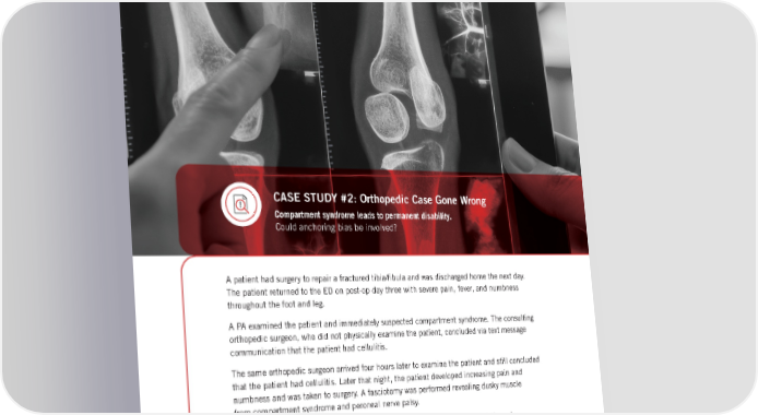 CASE STUDY #2: Orthopedic Case Gone Wrong Compartment syndrome leads to permanent disability. Could anchoring bias be involved? ( 12 ) A patient had surgery to repair a fractured tibia/fibula and was discharged home the next day. The patient returned to the ED on post-op day three with severe pain, fever, and numbness throughout the foot and leg. A PA examined the patient and immediately suspected compartment syndrome. The consulting orthopedic surgeon, who did not physically examine the patient, concluded via text message communication that the patient had cellulitis. The same orthopedic surgeon arrived four hours later to examine the patient and still concluded that the patient had cellulitis. Later that night, the patient developed increasing pain and numbness and was taken to surgery. A fasciotomy was performed revealing dusky muscle from compartment syndrome and peroneal nerve palsy. This young patient suffered necrosis of the entire anterior compartment of his lower leg requiring multiple surgeries and permanent disability. | HIDDEN IN PLAIN SIGHT | Exposing the Drivers of Diagnostic Error A DOSE OF INSIGHT ® Coverys |