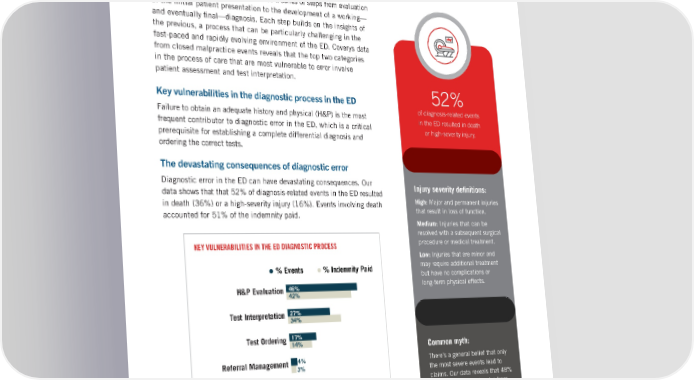 % Events % Indemnity Paid N=381 diagnostic-related events in the ED closed 2019-2023. KEY VULNERABILITIES IN THE ED DIAGNOSTIC PROCESS 46% 42% 27% 34% 17% 14% 4% 3% 3% 1% 2% 5% H&P Evaluation Test Interpretation Test Ordering Referral Management Receipt/Transmittal Results Follow Up with Patient ED SPOTLIGHT INSIGHTS FROM CLOSED ED CASES ( 4 ) The diagnostic process of care involves a series of steps from evaluation of the initial patient presentation to the development of a working— and eventually final—diagnosis. Each step builds on the insights of the previous, a process that can be particularly challenging in the fast-paced and rapidly evolving environment of the ED. Coverys data from closed malpractice events reveals that the top two categories in the process of care that are most vulnerable to error involve patient assessment and test interpretation. Key vulnerabilities in the diagnostic process in the ED Failure to obtain an adequate history and physical (H&P) is the most frequent contributor to diagnostic error in the ED, which is a critical prerequisite for establishing a complete differential diagnosis and ordering the correct tests. The devastating consequences of diagnostic error Diagnostic error in the ED can have devastating consequences. Our data shows that that 52% of diagnosis-related events in the ED resulted in death (36%) or a high-severity injury (16%). Events involving death accounted for 51% of the indemnity paid. 52% of diagnosis-related events in the ED resulted in death or high-severity injury. Injury severity definitions: High: Major and permanent injuries that result in loss of function. Medium: Injuries that can be resolved with a subsequent surgical procedure or medical treatment. Low: Injuries that are minor and may require additional treatment but have no complications or long-term physical effects. Common myth: There’s a general belief that only the most severe events lead to claims. Our data reveals that 48% of malpractice events arise from low- and medium-severity cases. | HIDDEN IN PLAIN SIGHT | Exposing the Drivers of Diagnostic Error A DOSE OF INSIGHT ® Coverys |