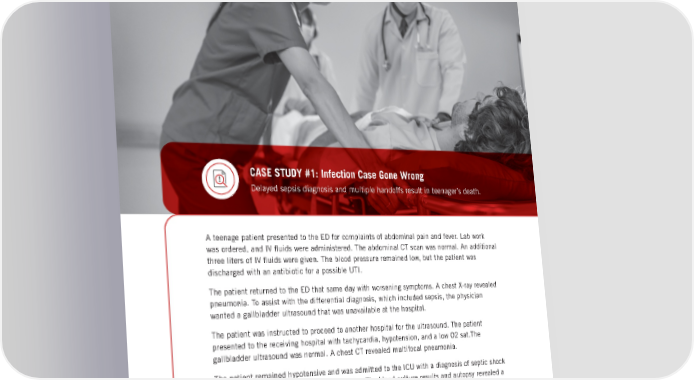 ( 10 ) A teenage patient presented to the ED for complaints of abdominal pain and fever. Lab work was ordered, and IV fluids were administered. The abdominal CT scan was normal. An additional three liters of IV fluids were given. The blood pressure remained low, but the patient was discharged with an antibiotic for a possible UTI. The patient returned to the ED that same day with worsening symptoms. A chest X-ray revealed pneumonia. To assist with the differential diagnosis, which included sepsis, the physician wanted a gallbladder ultrasound that was unavailable at the hospital. The patient was instructed to proceed to another hospital for the ultrasound. The patient presented to the receiving hospital with tachycardia, hypotension, and a low O2 sat.The gallbladder ultrasound was normal. A chest CT revealed multifocal pneumonia. The patient remained hypotensive and was admitted to the ICU with a diagnosis of septic shock pneumonia. The patient died a few days later. The blood culture results and autopsy revealed a rare Fusobacterium infection. CASE STUDY #1: Infection Case Gone Wrong Delayed sepsis diagnosis and multiple handoffs result in teenager’s death. | HIDDEN IN PLAIN SIGHT | Exposing the Drivers of Diagnostic Error A DOSE OF INSIGHT ® Coverys |