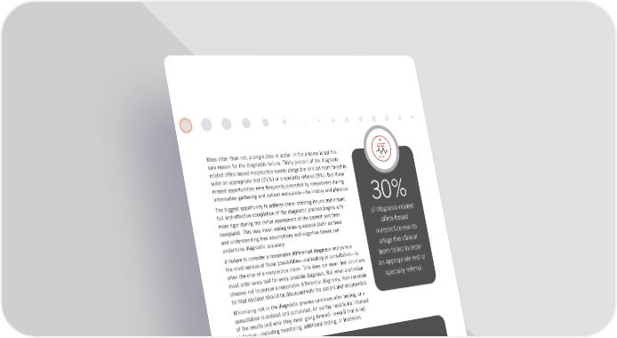 More often than not, a single step or action in the process is not the sole reason for the diagnostic failure. Thirty percent of the diagnosis- related office-based malpractice events allege the clinical team failed to order an appropriate test (21%) or a specialty referral (9%). But these missed opportunities were frequently preceded by breakdowns during information gathering and patient evaluation—the history and physical. The biggest opportunity to address these ordering issues and ensure full and effective completion of the diagnostic process begins with more rigor during the initial assessment of the patient and their complaint. This may mean asking more questions (both parties) and understanding how assumptions and cognitive biases can undermine diagnostic accuracy. A failure to consider a reasonable differential diagnosis and pursue the most serious of those possibilities—via testing or consultation—is often the crux of a malpractice claim. This does not mean that clinicians must order every test for every possible diagnosis. But when a clinician chooses not to pursue a reasonable differential diagnosis, their rationale for that decision should be discussed with the patient and documented. Minimizing risk in the diagnostic process continues after testing, or a consultation is ordered and completed. All parties need to be informed of the results and what they mean going forward—even if that is not definitive—including monitoring, additional testing, or treatment. ( 10 ) | HIDDEN IN PLAIN SIGHT | Exposing the Drivers of Diagnostic Error A DOSE OF INSIGHT ® Coverys | 30% of diagnosis-related office-based malpractice events allege the clinical team failed to order an appropriate test or specialty referral. Key definitions: • Anchoring bias: The tendency to perceptually lock on to salient features of the patient’s initial presentation too early in the diagnostic process. • Confirmation bias: Looking for confirming evidence to support a diagnosis rather than disconfirming evidence to refute it. Did you know? Cognitive bias is recognized as a potential contributor to diagnostic error. One study8 found that cases involving indicators of bias were 69% more likely to close with indemnity payment and 10% more likely to result in severe injury.