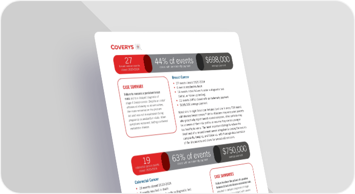 ( 13 ) | HIDDEN IN PLAIN SIGHT | Exposing the Drivers of Diagnostic Error A DOSE OF INSIGHT ® Coverys | Breast Cancer • 27 events closed 2020-2024 • 6 events resulted in death • 11 events noted failure to order a diagnostic test (initial, or follow-up testing) • 12 events (44%) closed with an indemnity payment • $698,000 average payment About one in eight American females (and one in every 726 males) will develop breast cancer.12 While clinicians may encounter patients who proactively report breast-related concerns, other patients may be unaware of their risk profile, or assume they are too young or too healthy to worry. The most important strategy to reduce the likelihood of a missed breast cancer allegation is closing the loop on complaints, imaging, and follow up, with thorough documentation of the discussions and plans for unresolved concerns. 27 breast cancer events closed 2020-2024 $698,000 average payment 44% of events closed with an indemnity payment CASE SUMMARY Failure to reassess a persistent breast mass led to a delayed diagnosis of stage 4 breast cancer. Despite an initial ultrasound showing no abnormalities, the mass remained on the problem list and was not re-evaluated during pregnancy or postpartum visits. When symptoms worsened, testing confirmed metastatic disease. Colorectal Cancer • 19 events closed 2020-2024 • 8 events resulted in death • 7 events noted failure to order a diagnostic test (initial, or follow-up testing) • 12 events (63%) closed with an indemnity payment • $750,000 average payment About one in every 25 Americans will develop colorectal cancer, with a recent increase among patients younger than 50 years old.13 Several factors may contribute to the failure to diagnose colorectal cancer including: patient embarrassment; the fact that rectal bleeding has a high likelihood of being caused by a benign condition; and that the most effective screening process is a colonoscopy which poses numerous hurdles. For patients who present with a complaint of rectal bleeding, an assumption of hemorrhoids should only be made after engaging in a discussion that explores other risks (such as a family history of colon cancer) and diagnostic options. Within the subset of patients for whom a colonoscopy is recommended—and scheduled—ensuring they can and will comply with all the pre- and post-procedure requirements decreases the risk of a missed cancer diagnosis. CASE SUMMARIES Failure to inform the patient of a positive hemoccult test and discuss associated risks resulted in delayed diagnosis of stage 4 colon cancer in a patient with severe diverticulosis. Failure to follow up on a positive fecal occult blood test and ensure colonoscopy completion led to an 18-month delay in diagnosing metastatic colon cancer. Despite ongoing symptoms, providers attributed them to alcohol use and did not address prior abnormal test results. 19 colorectal cancer events closed 2020-2024 $750,000 average payment 63% of events closed with an indemnity payment