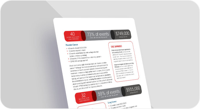 ( 12 ) Prostate Cancer • 40 events closed 2020-2024 • 10 events resulted in death • 22 events noted failure to order a diagnostic test (initial, or follow-up testing) • 29 events (73%) closed with an indemnity payment • $749,000 average payment About one in every eight American males will develop prostate cancer.10 Although the medical community continues to look for consensus on how to approach prostate cancer screening and treatment, it remains a high-profile health concern. Ethnicity and family history must be considered in discussions around PSA testing, and quality-of-life issues must be factored into treatment. Documentation is crucial, including the notation of all discussions about screening and treatment options (and the patient’s informed refusal). If PSA testing has commenced, it is imperative to follow, discuss, and document the trajectory of results. 40 prostate cancer events closed 2020-2024 | HIDDEN IN PLAIN SIGHT | Exposing the Drivers of Diagnostic Error A DOSE OF INSIGHT ® Coverys | $749,000 average payment 73% of events closed with an indemnity payment CASE SUMMARIES Failure to document missed appointments and screening refusals complicated the defense of a failure-to-diagnose prostate cancer claim. The physician’s testimony that they followed protocol could not be supported due to lack of documentation. Failure to recognize and follow up on rising PSA levels led to a missed opportunity for early prostate cancer detection. A significant PSA increase (1.7 to 2.9) was not addressed or monitored over two years, and no related discussions were documented. Lung Cancer • 32 events closed 2020-2024 • 26 events resulted in death • 16 events noted failure to order a diagnostic test (initial, or follow-up testing) • 19 events (59%) closed with an indemnity payment • $555,000 average payment About one in every 17 or 18 Americans will develop lung cancer.11 While tobacco use has dropped, a history of smoking remains a key risk factor and a trigger for screening. A prominent concern is appropriate follow up and communication after an incidental finding from a chest X-ray. Radiologists and primary care providers (PCPs) need to ensure patients are aware of such findings and next steps—even when the patient is undergoing care for a different concern (e.g., what prompted the X-ray). Repeated complaints of an unresolved cough are another red flag that may need further investigation of the possibility of lung cancer. CASE SUMMARIES Failure to follow up on abnormal chest X-ray findings in a long-term smoker with hemoptysis resulted in an 18-month delay in diagnosing lung cancer. Despite a radiologist’s recommendation for a CT scan, no imaging was ordered or discussed during multiple visits. Failure to act on radiology recommendations for a possible mediastinal mass led to a 13-month delay in diagnosing lung cancer. Although the PCP acknowledged the X-ray report advising follow up with a CT scan, the provider did not order follow up imaging despite subsequent visits until symptoms worsened and cancer was confirmed. 32 lung cancer events closed 2020-2024 $555,000 average payment 59% of events closed with an indemnity payment